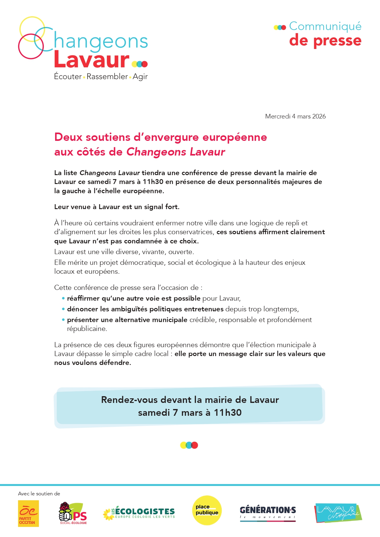 Le 15 mars, faisons le choix d’une ville plus juste et plus ouverte Votez Changeons Lavaur !